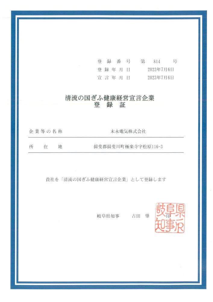 清流の国ぎふ健康経営宣言企業に登録させていただきました。 従業員の健康を第一に頑張っていきたいです。