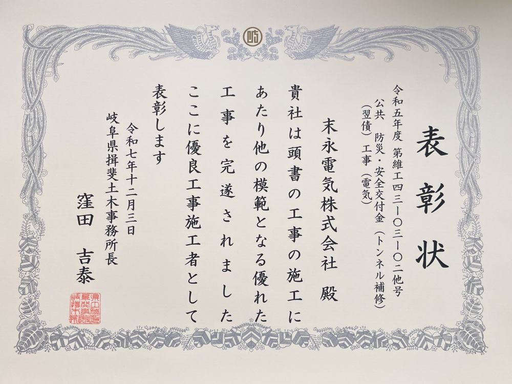 令和7年度優良工事施工者表彰を頂きました。