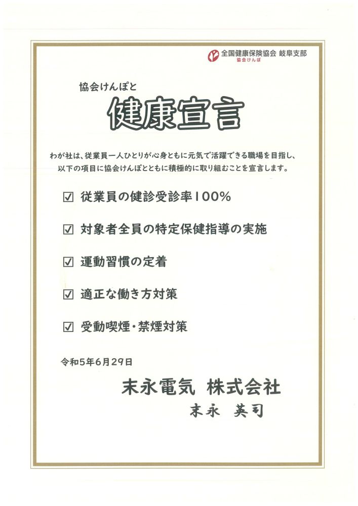 清流の国ぎふ健康経営宣言企業に登録させていただきました。 従業員の健康を第一に頑張っていきたいです。